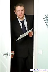 Spicy secretary in barely black hose dildotoying before having frenetic sex